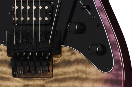 The Italian word “Volante” translates to “flying” or “light” in English and signifies the musical ideas of speed and movement. As a musical direction, it commands playing fast and fluidly. Kramer’s latest platform, the Volante, embodies that spirit of speed and fluidity. The Volante Quilt HHFR offers cutting-edge features, including a lightweight alder body with a gorgeous AAAA quilt maple veneer top and forearm and body comfort carves. The 3-piece, satin-finished maple neck is bolted to the body with five bolts and ferrules and has a sculpted heel for improved upper fret access. It also features the new Kramer Key Lock system. The Key Lock, developed by Senior Product Development Engineer Richard Akers, provides incredible neck stability. Paired with Kramer's 5-bolt neck-to-body joint, it prevents movement in the neck pocket, increasing vibrational tone transfer, sustain, and intonation.